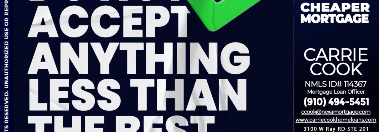 Hi, my name is Carrie Cook. I’m a Loan Officer with NEXA Mortgage LLC., offering personalized mortgage solutions, fast customized quotes, great rates and service with integrity.
