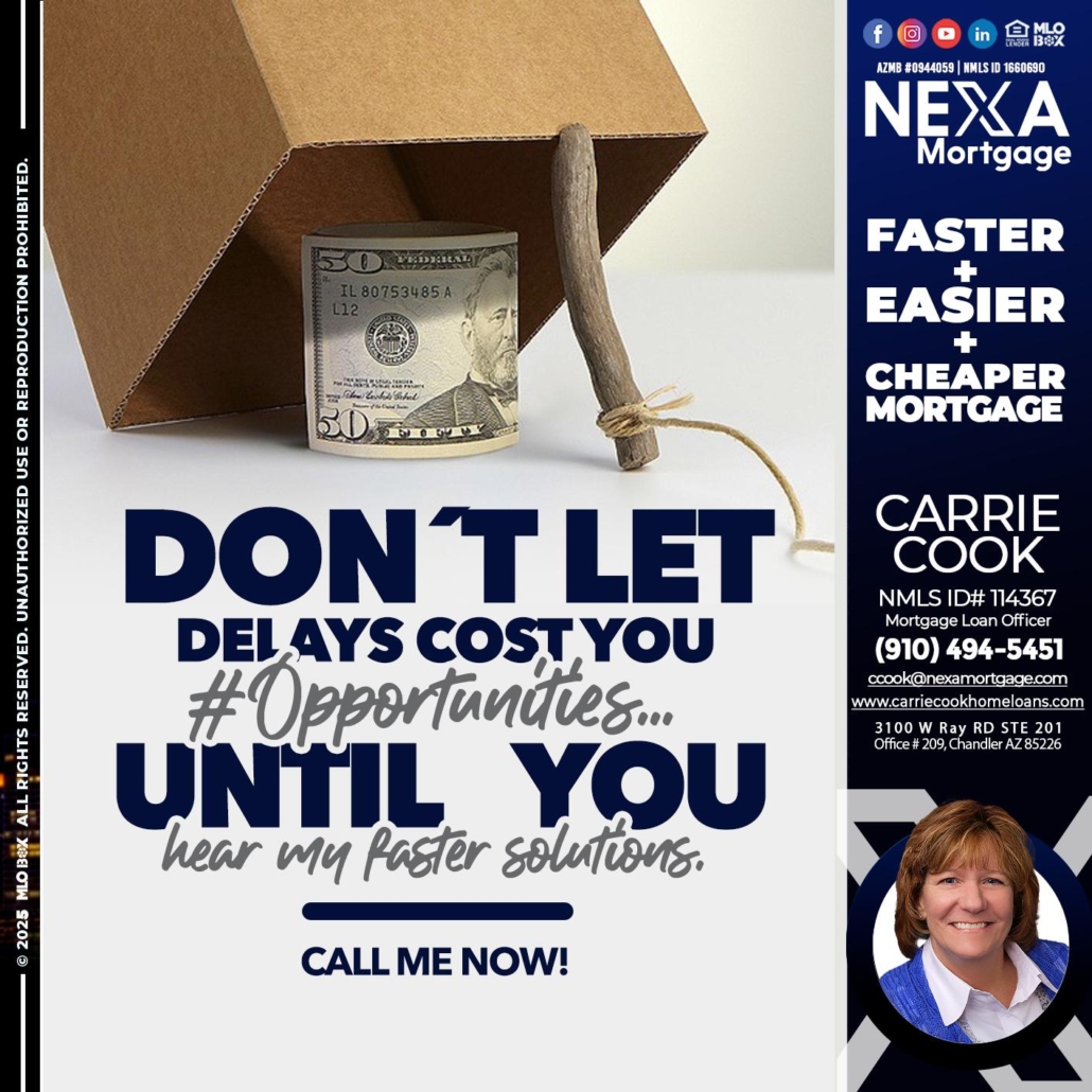 Hi, my name is Carrie Cook. I’m a Loan Officer with NEXA Mortgage LLC., offering personalized mortgage solutions, fast customized quotes, great rates and service with integrity.