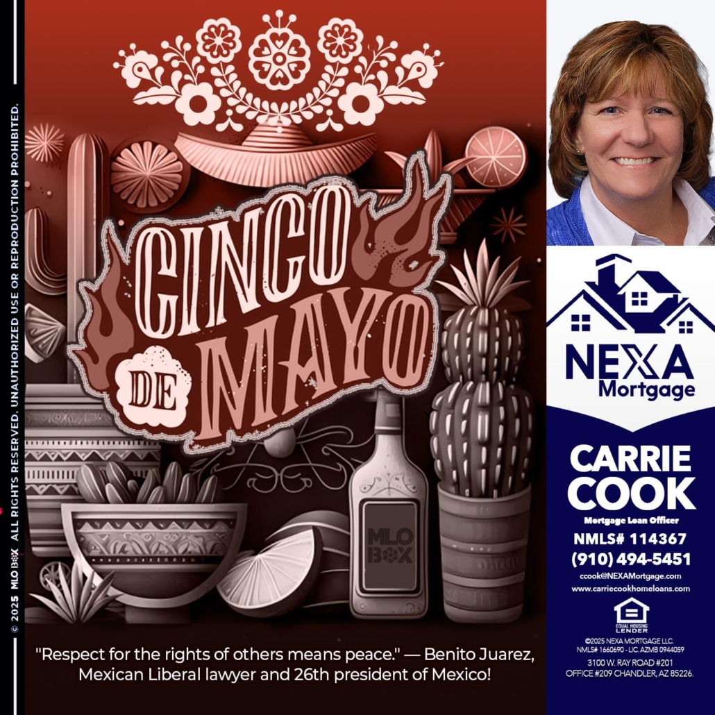 Hi, my name is Carrie Cook. I’m a Loan Officer offering personalized mortgage solutions, fast customized quotes, great rates and service with integrity. And I wanted to take the time to wish all my Mexican Americans friends and colleagues, a wonderful time with your families celebrating your wonderful traditions.