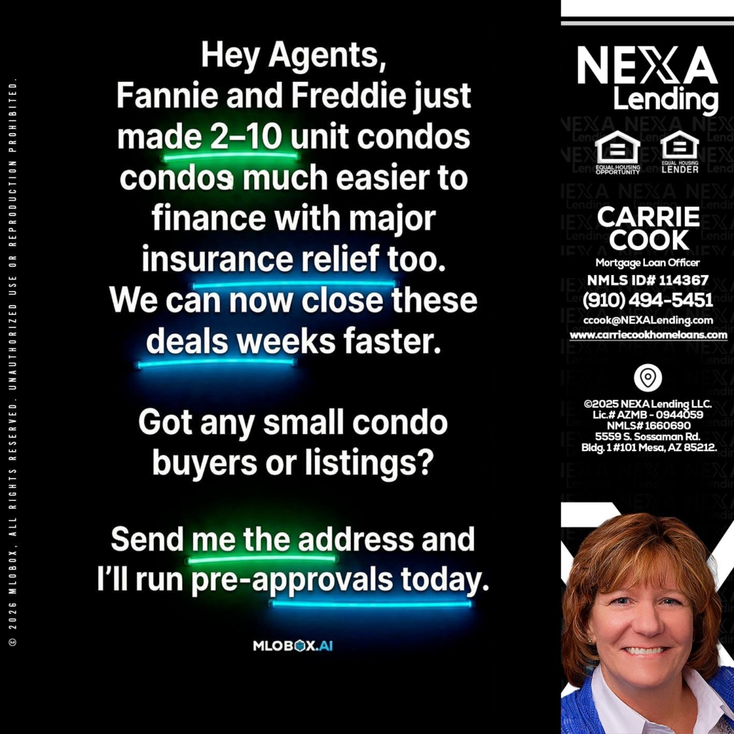 HEY AGENTS - Carrie Cook -Mortgage Loan OfficerHi, my name is Carrie Cook. I’m a Loan Officer with NEXA Lending LLC., offering personalized mortgage solutions, fast customized quotes, great rates and service with integrity.