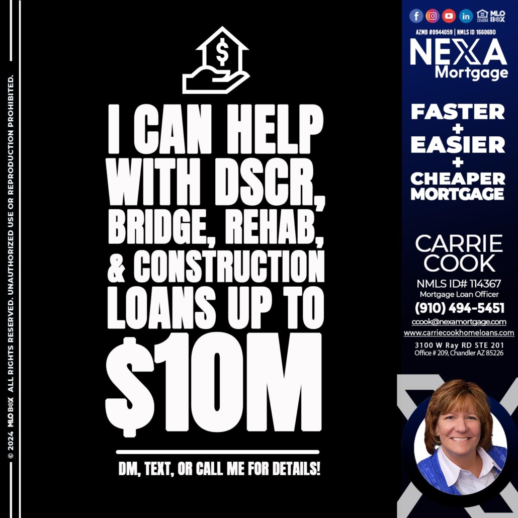 Hi, my name is Carrie Cook. I’m a Loan Officer with NEXA Mortgage LLC., offering personalized mortgage solutions, fast customized quotes, great rates and service with integrity.