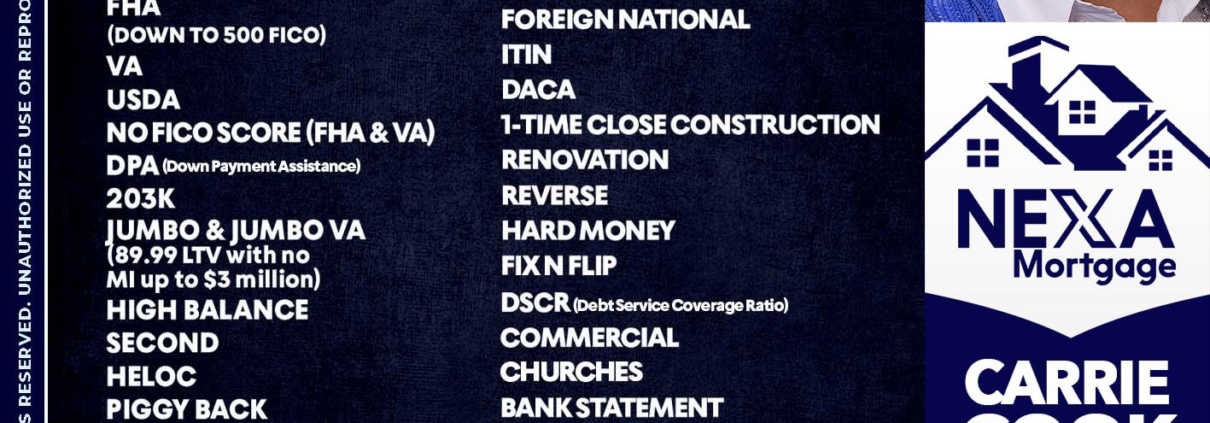 Hi, my name is Carrie Cook. I’m a Loan Officer with NEXA Mortgage LLC., offering personalized mortgage solutions, fast customized quotes, great rates and service with integrity.