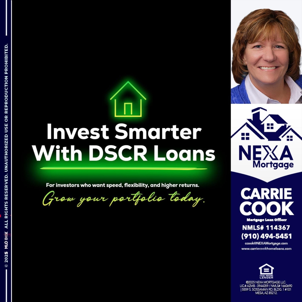 Hi, my name is Carrie Cook. I’m a Loan Officer with NEXA Mortgage LLC., offering personalized mortgage solutions, fast customized quotes, great rates and service with integrity.