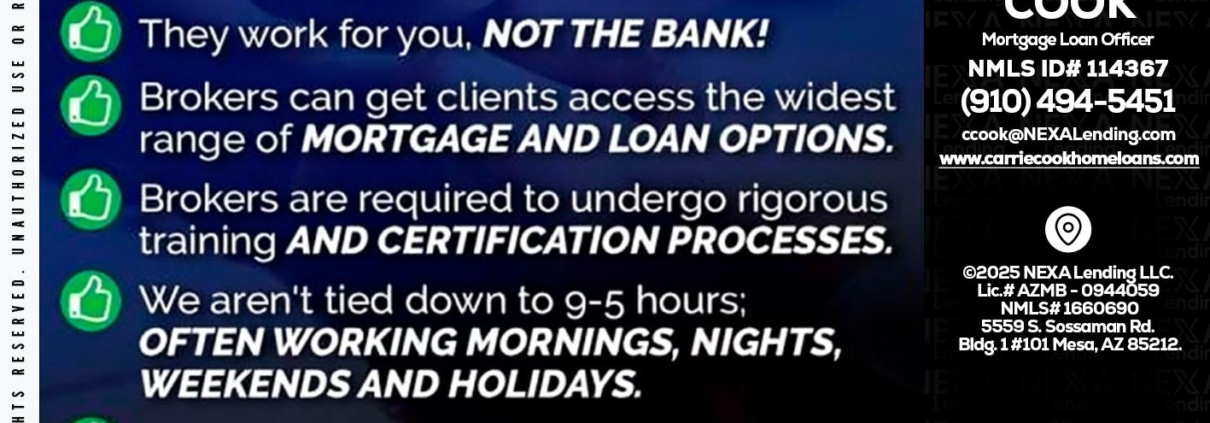 MORTGAGE BROKER - Carrie Cook -Mortgage Loan OfficerHi, my name is Carrie Cook. I’m a Loan Officer with NEXA Lending LLC., offering personalized mortgage solutions, fast customized quotes, great rates and service with integrity.