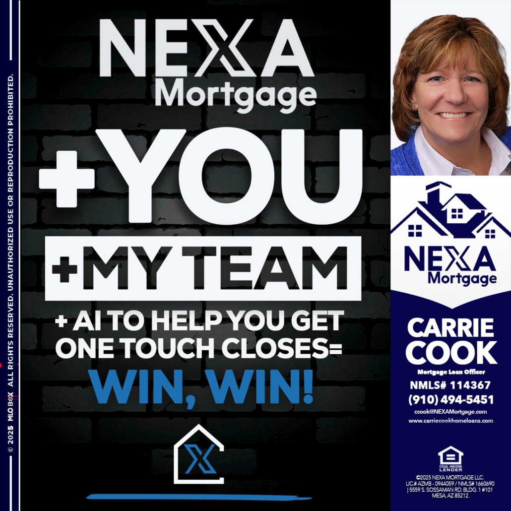 Hi, my name is Carrie Cook. I’m a Loan Officer with NEXA Mortgage LLC., offering personalized mortgage solutions, fast customized quotes, great rates and service with integrity.