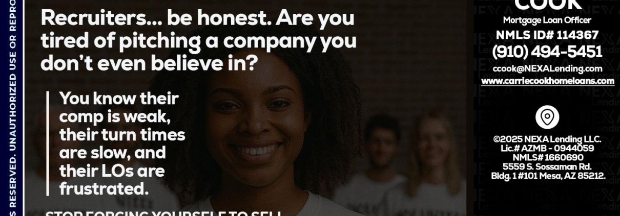 Hi, my name is Carrie Cook. I’m a Loan Officer with NEXA Mortgage LLC., offering personalized mortgage solutions, fast customized quotes, great rates and service with integrity.