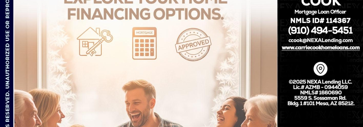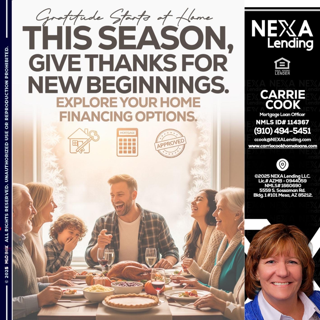 Hi, my name is Carrie Cook. I’m a Loan Officer with NEXA Mortgage LLC., offering personalized mortgage solutions, fast customized quotes, great rates and service with integrity.