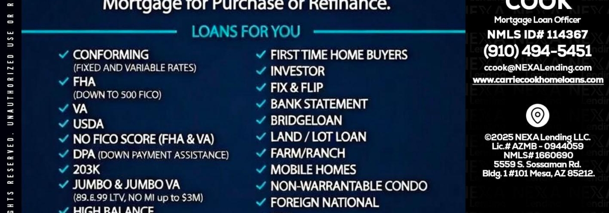 Hi, my name is Carrie Cook. I’m a Loan Officer with NEXA Lending LLC., offering personalized mortgage solutions, fast customized quotes, great rates and service with integrity.