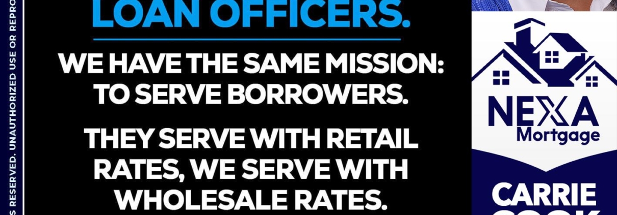 Hi, my name is Carrie Cook. I’m a Loan Officer with NEXA Mortgage LLC., offering personalized mortgage solutions, fast customized quotes, great rates and service with integrity.