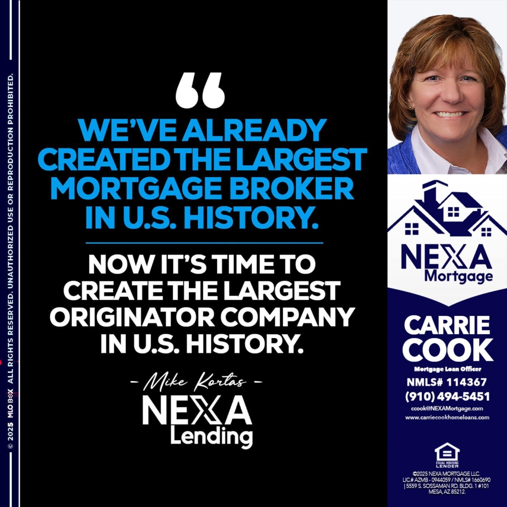 Hi, my name is Carrie Cook. I’m a Loan Officer with NEXA Mortgage LLC., offering personalized mortgage solutions, fast customized quotes, great rates and service with integrity.