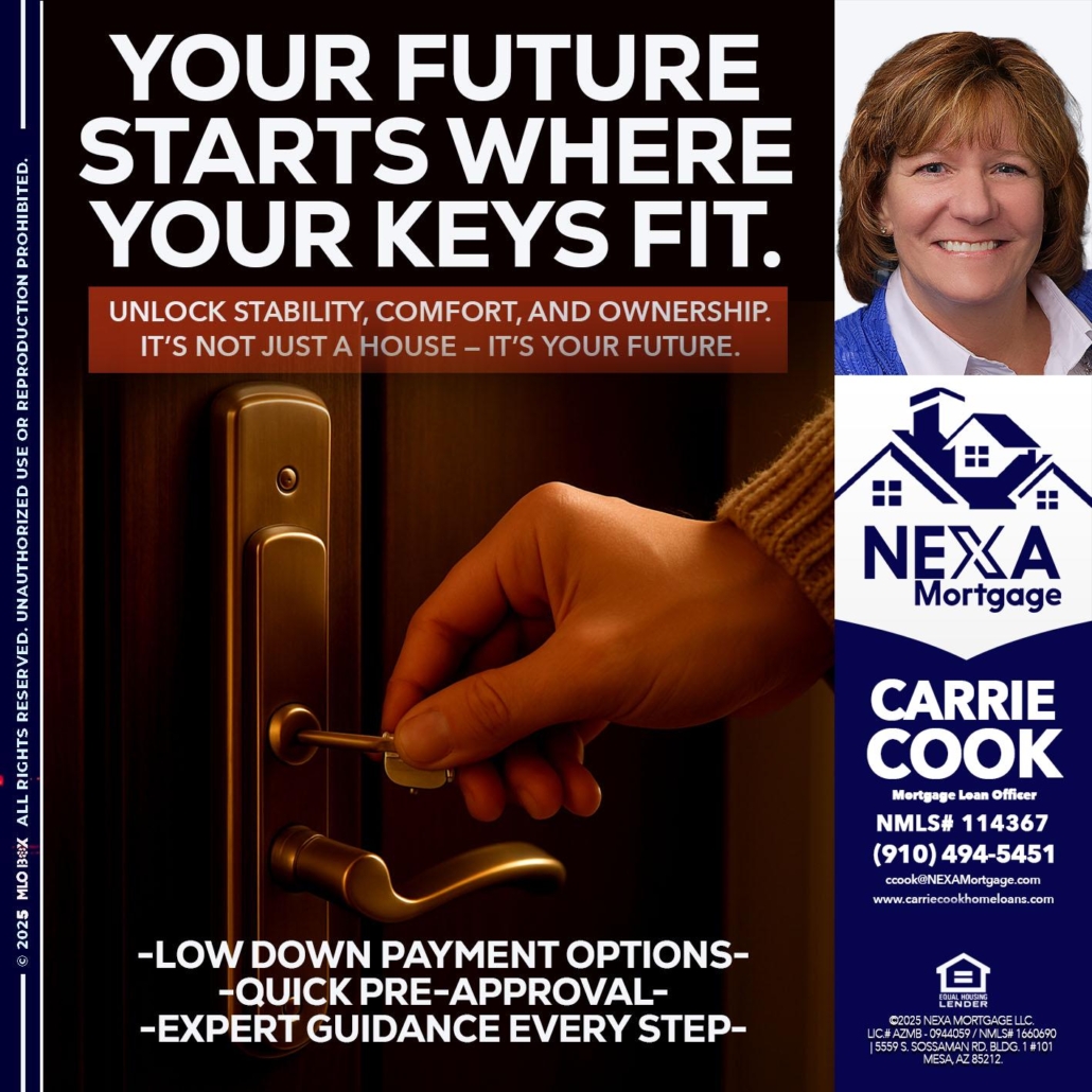 Hi, my name is Carrie Cook. I’m a Loan Officer with NEXA Mortgage LLC., offering personalized mortgage solutions, fast customized quotes, great rates and service with integrity.